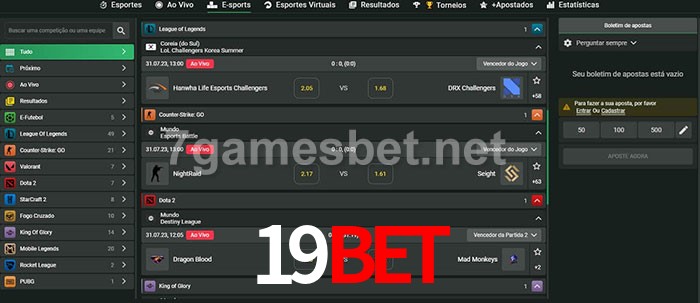 O 19bet oferece uma grande seleção de opções de apostas em e-sports com probabilidades competitivas
